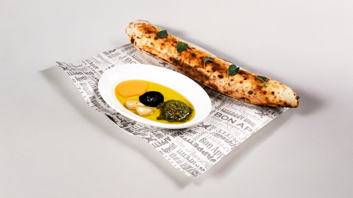 מוגש עם שמן זית בלסמי, ויניגרט עגבניות, שום קונפי וסלסה כוסברה פיקנטית