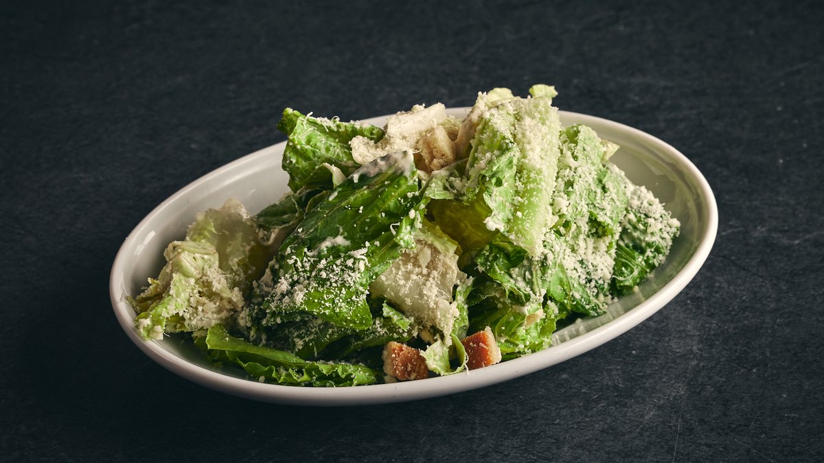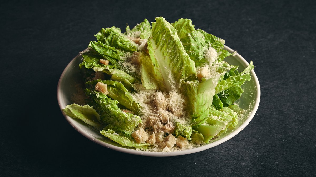 לבבות חסה, קרוטונים, פרמג׳אנו רג׳אנו, רוטב קיסר מכיל אנשובי