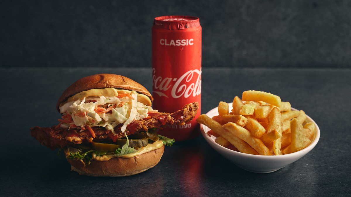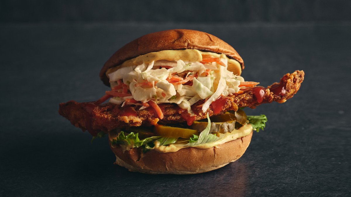 קריספי צ'יקן בתערובת תיבול קראנצ'ית, קולסלאו, חסה אייסברג, מלפפון כבוש, חלפיניו, איולי סנטה פה, איולי אלבמה בלחמניה רכה (מכיל גלוטן)