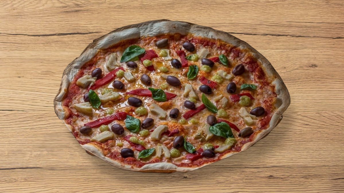 מגש פיצה אישי עם רוטב עגבניות, ארטישוק, זיתי קלמטה, פלפל קלוי, שום ובזיליקום