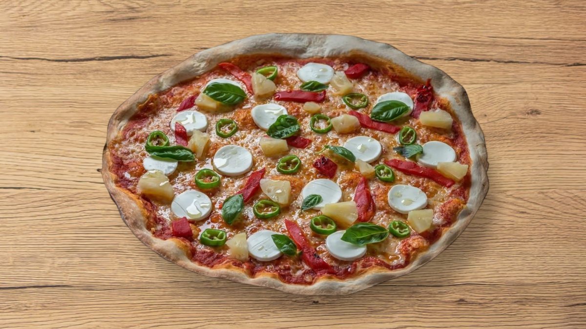 מגש פיצה אישי עם רוטב עגבניות, אננס, גבינת עיזים, פלפל חריף, בזיליקום ופלפל קלוי