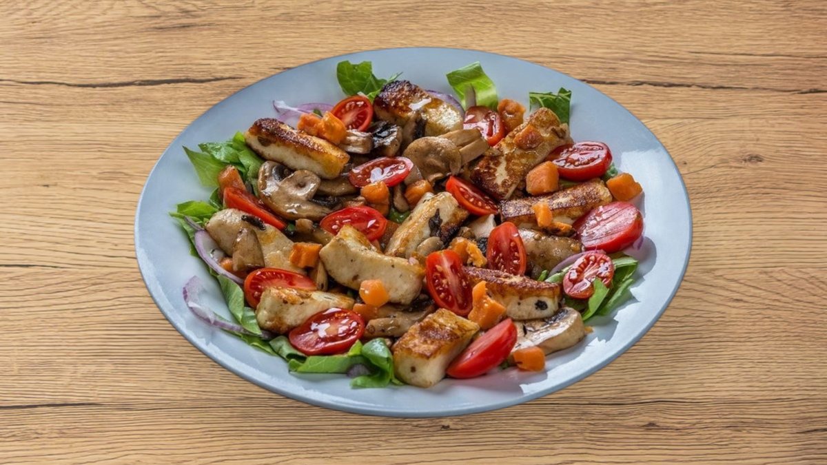 גבינת חלומי, חסה, עגבניות שרי, בטטה, פטריות, בצל סגול, זיתי קלמטה ודבש