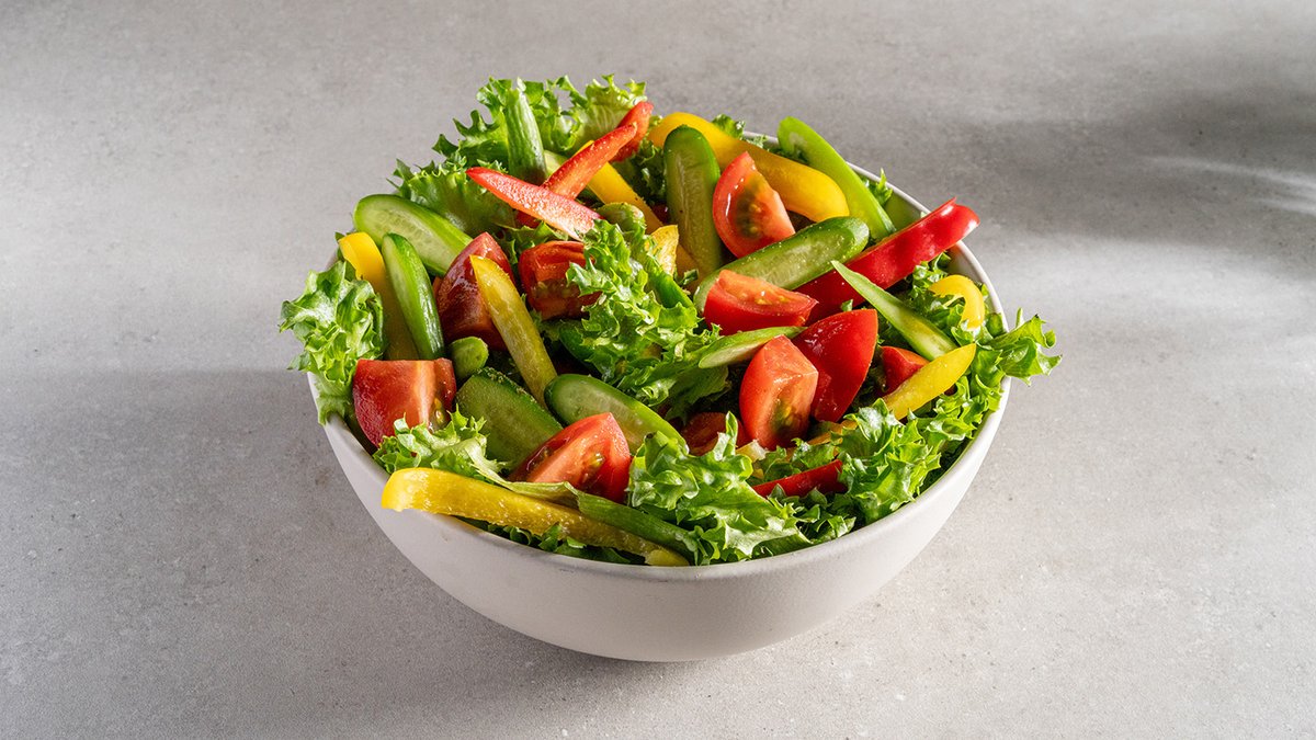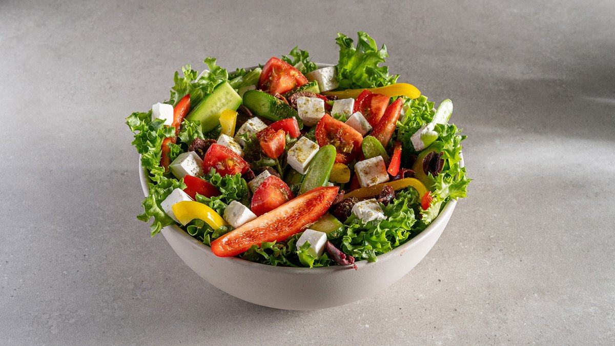 חסה, מלפפון, עגבניות שרי, בצל סגול, בולגרית וזיתי קלמטה
