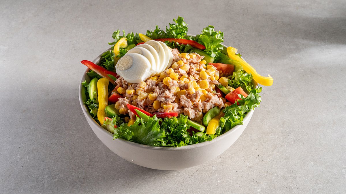 חסה, מלפפון, עגבניות שרי, ביצה קשה, טונה וחמוצים