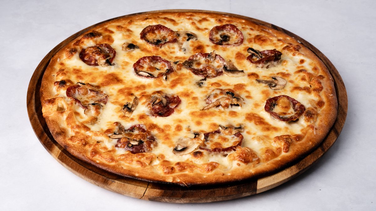 רוטב שמנת, גבינת סלמי בקר ופטריות עם משיחה של שמן זית ושום על הקשה. ניתן להוסיף תוספות בתשלום