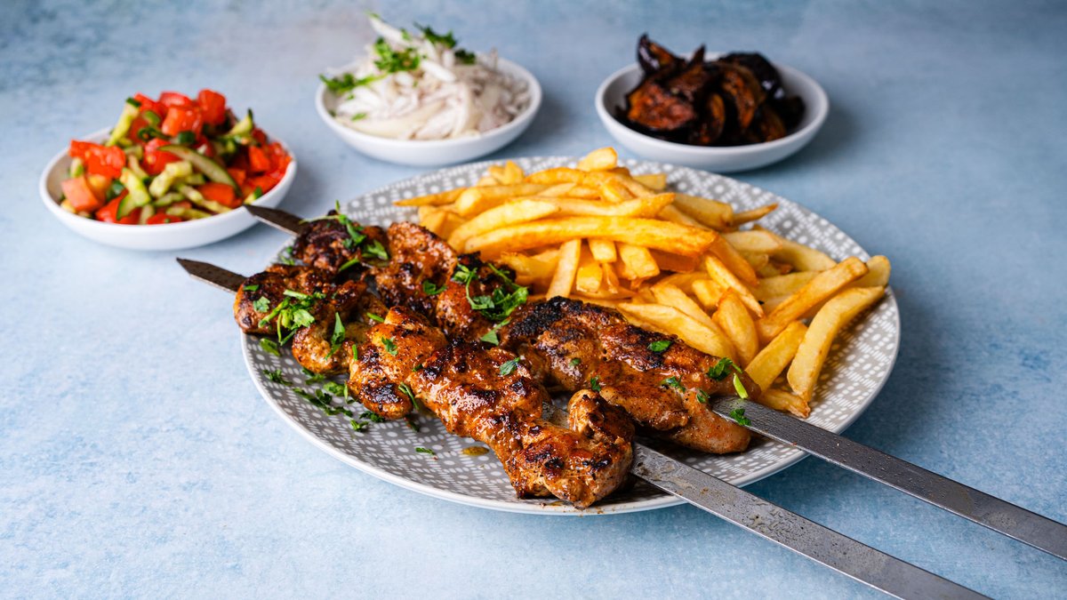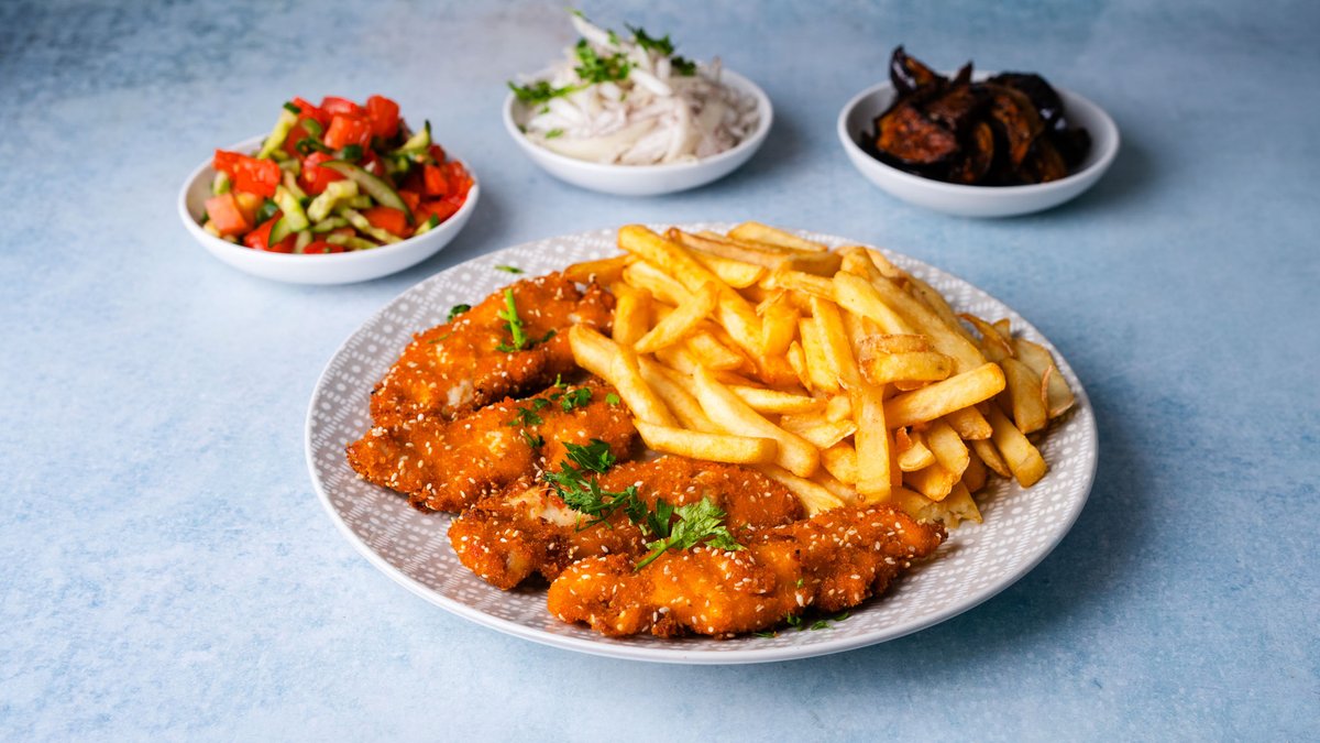 מוגש עם צ׳יפס, 2 סלטים לבחירה ופיתה