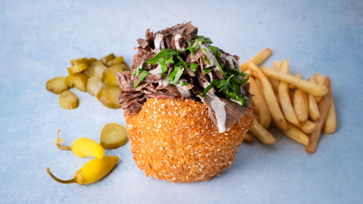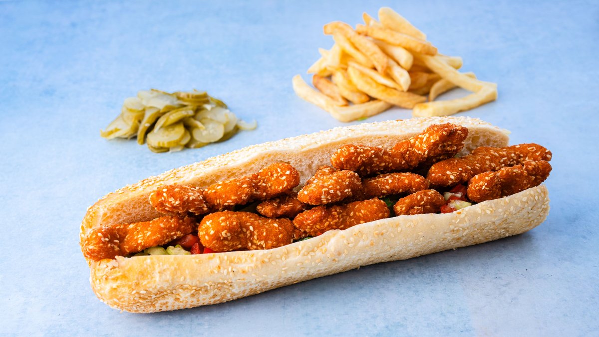 מוגש עם צ׳יפס, טחינה, חמוצים, פיתה וסלטים לבחירה