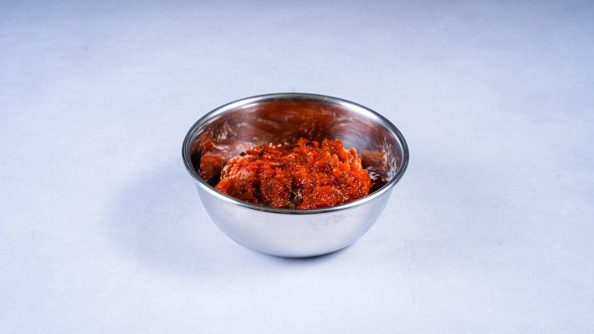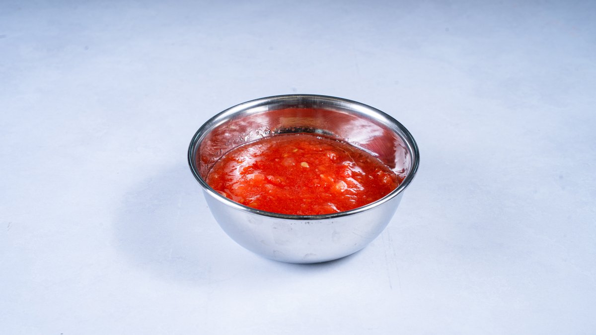 מוגש עם ביצה קשה, רסק עגבניות וחריף
