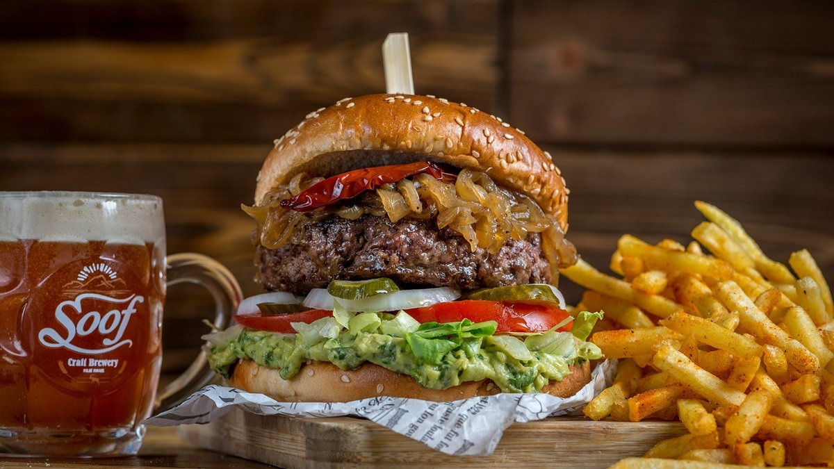 המבורגר 100 גרם מבשר אסאדו, חסה, עגבניה, מלפפוץ חמוץ, בצל, חרדל ומיונז בלחמניה מוגש עם צ׳יפס