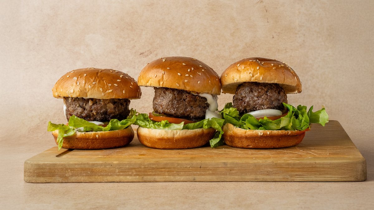 שלושה מיני המבורגרים של 100 גרם כל אחד מוגש ללא ציפס