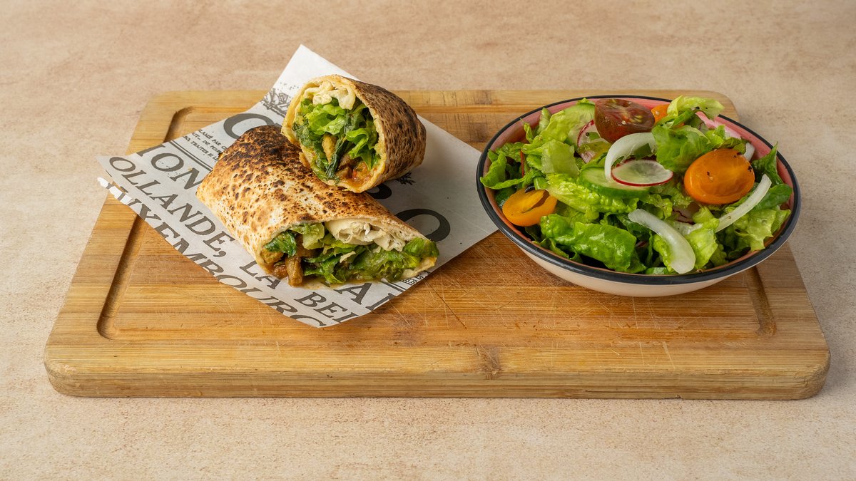 טורטיה במילוי שווארמה טבעונית, חסה, גוואקמולי וסלסת עגבניות