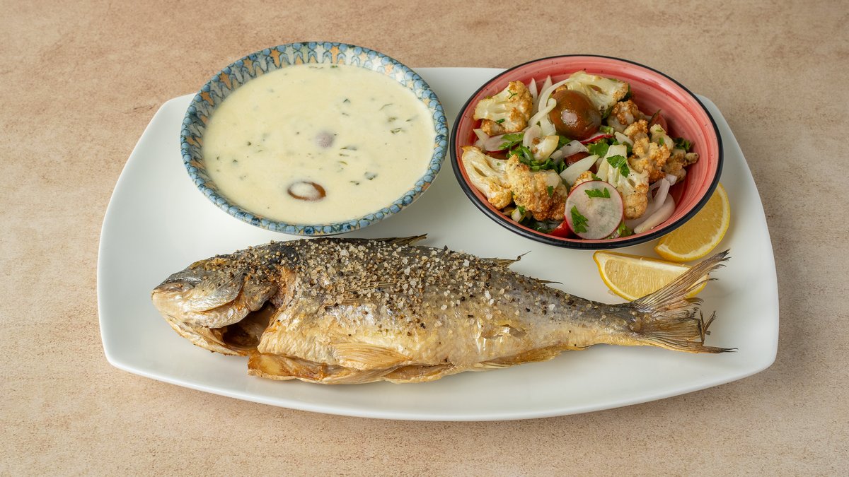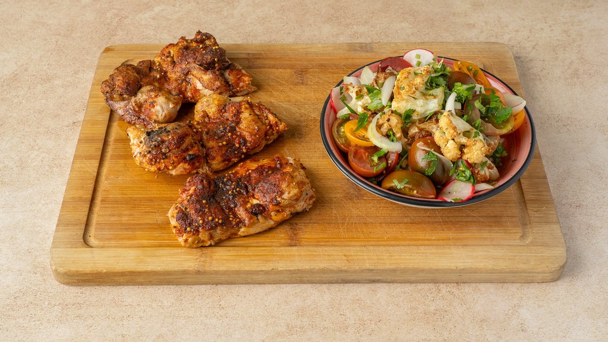 פרגית מתובלת בפילדלפיה, מלח ופלפל מוגש עם סלט כרובית
