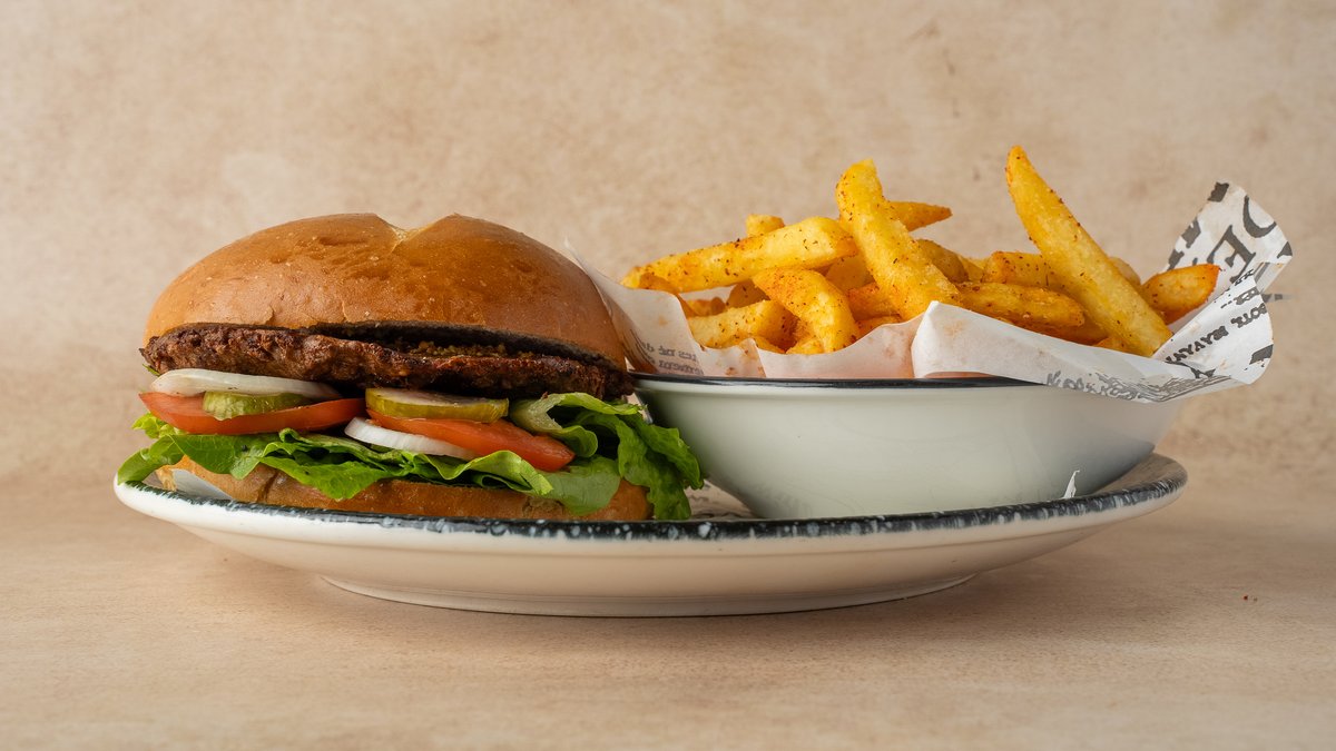 המבורגר טבעוני 100 גרם, חסה, עגבניה, מלפפון חמוץ, בצל, מיונז וחרדל בלחמניה