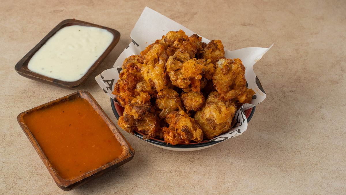 פרחי כרובית טריים מטוגנים בבלילת בירה מוגש עם רוטב גבינה כחולה וצ׳ילי מתוק ביתי