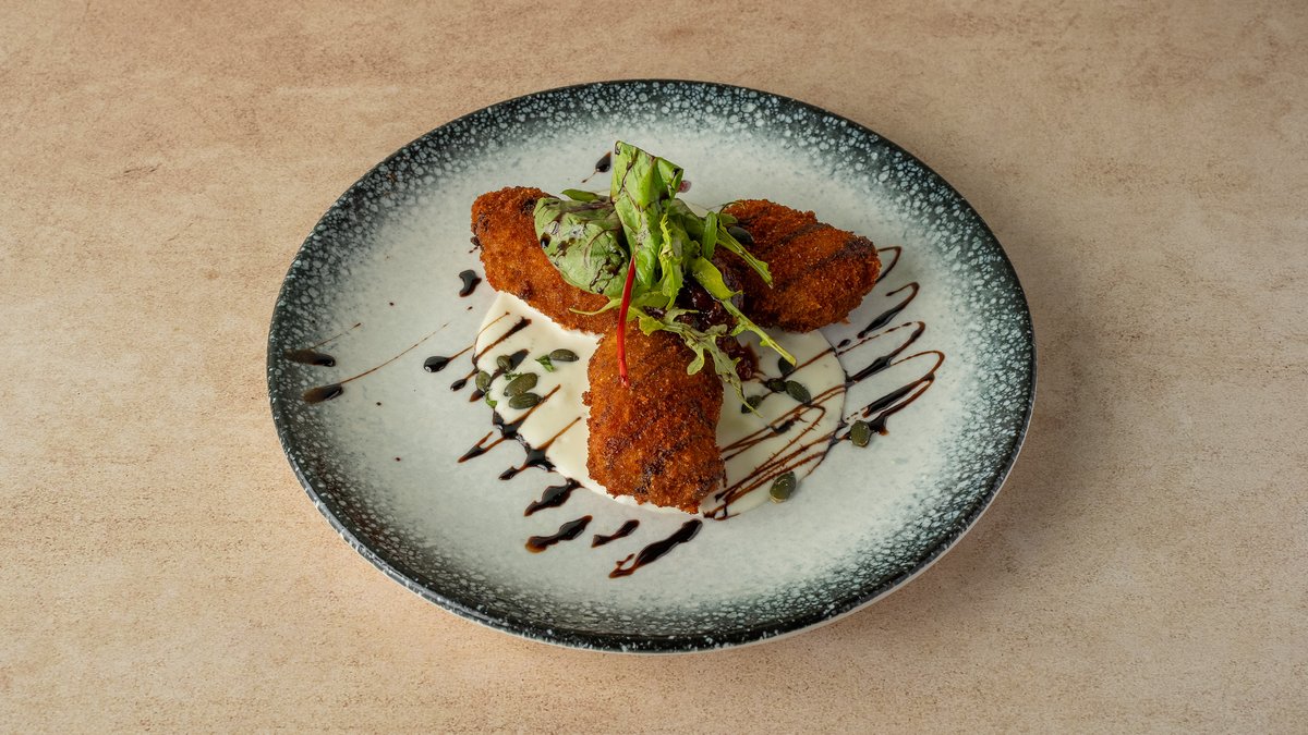 טבעות בצל בציפוי פנקו מוגש עם רוטב שמנת, גבינה כחולה וצ׳ילי מתוק ביתי