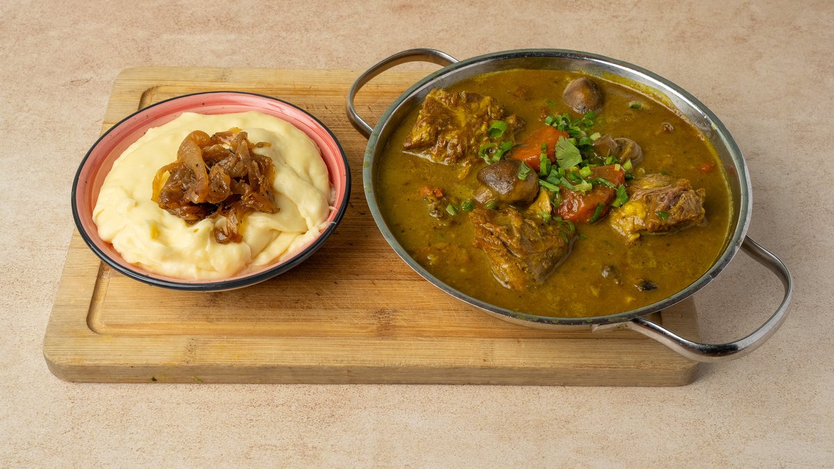 תבשיל כתף בקר עם גזר, בצל ופטריות שמפניון, בבירת פורטר וסילאן מוגש עם פירה פרמז׳ן וריבת בצל