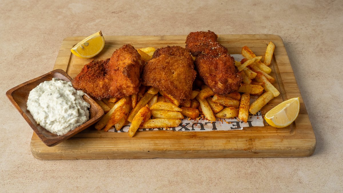 פילה שפמנון מושרה בבלילת בירה מוגש עם צ׳יפס ורוטב טרטר