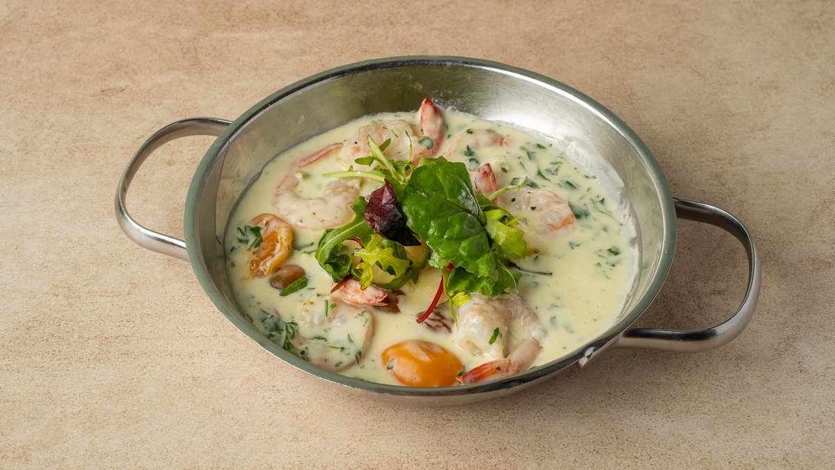 פסטה פוזילי עם שרימפס, קלמרי ומולים ברוטב שמנת, עשבי תיבול, דנה בלו, שרי ופרמז׳ן