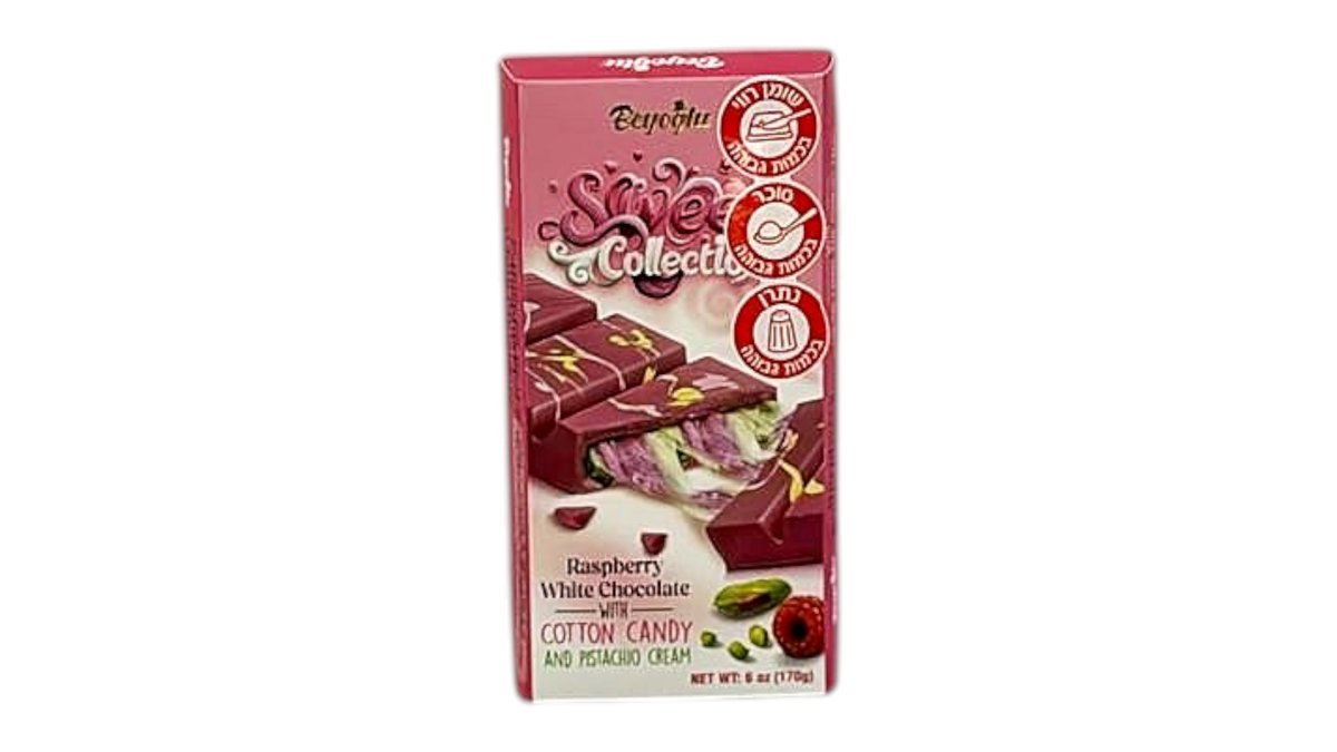 טבלת שוקולד לבן פטל-מילוי שיערות סבתא וקרם פיסטוקים