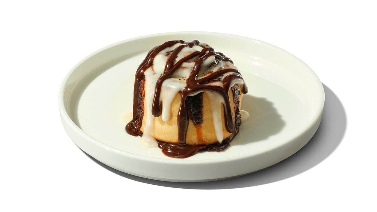 סינבון במילוי שוקולד אמתי עם זיגוג של קרם שמנת מלמעלה וסירופ שוקולד