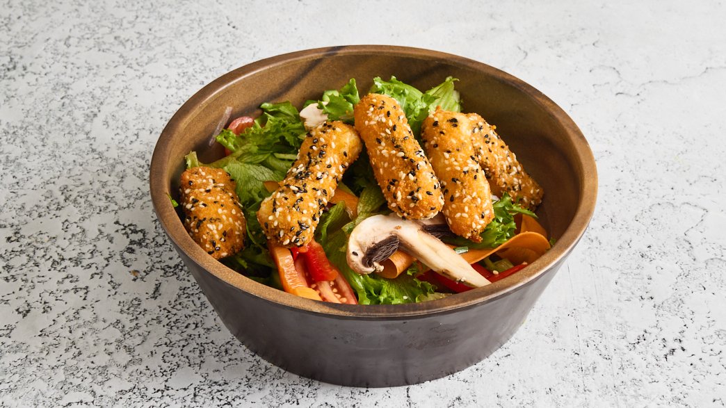 תערובת חסה, עגבניות שרי, מלפפון וגזר, בתיבול ויניגרט הדרים, עם קוביות חלומי בציפוי פרורי לחם ושומשום