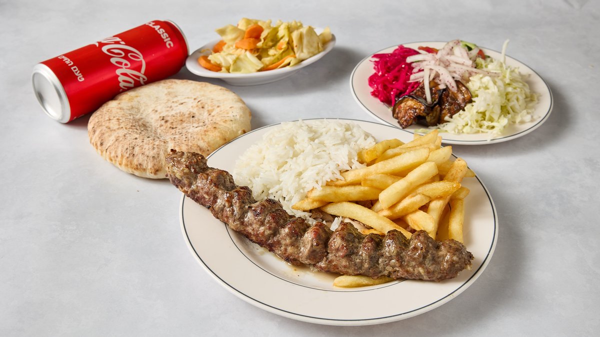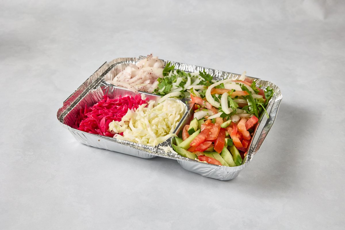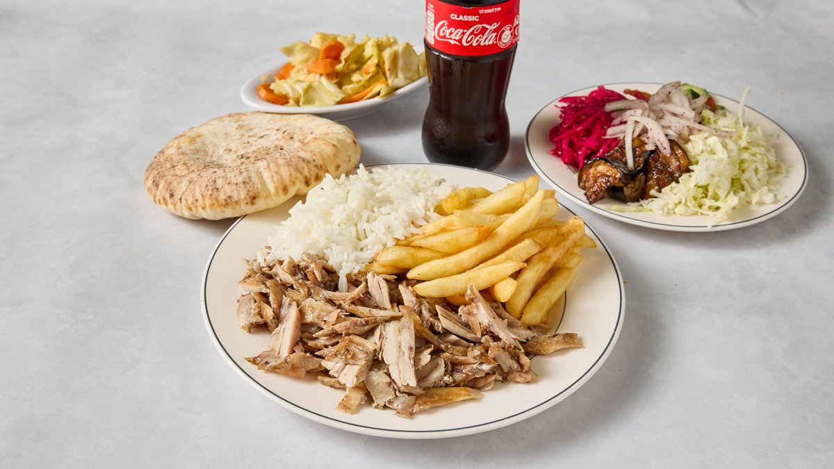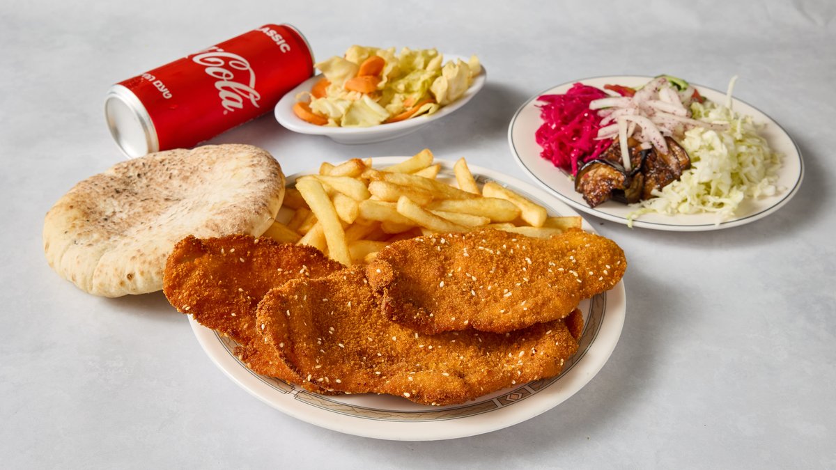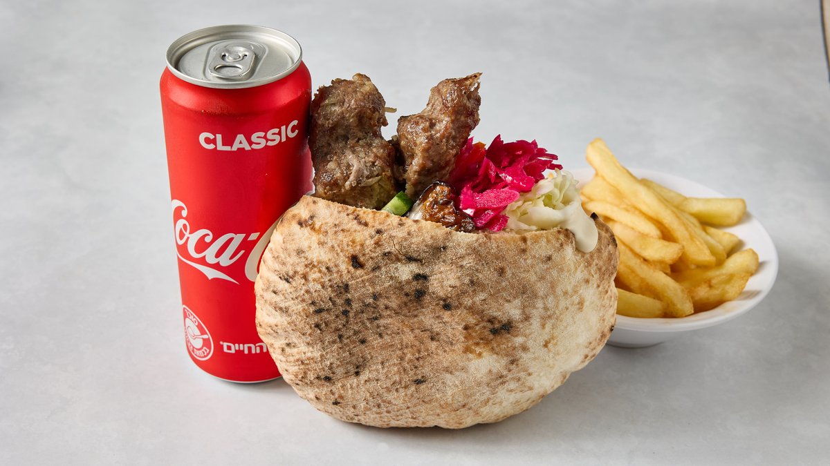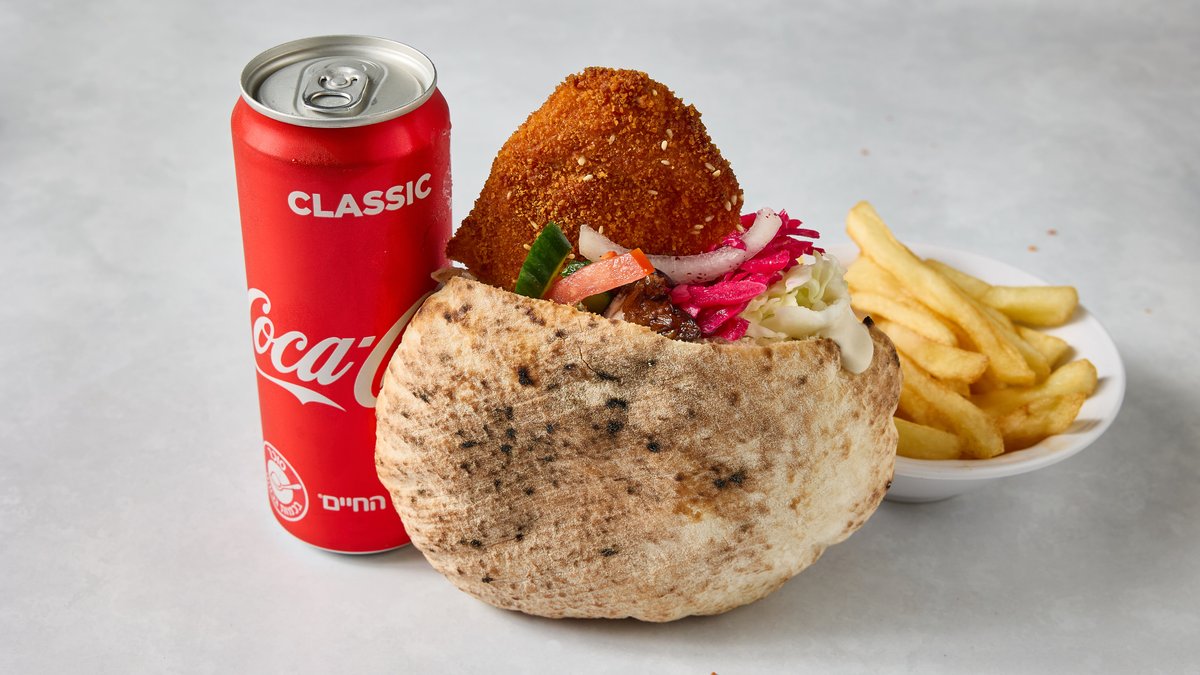 בחרו צורת הגשה, סלטים וממרחים מוגש עם צ׳יפס, פיתה ושתייה