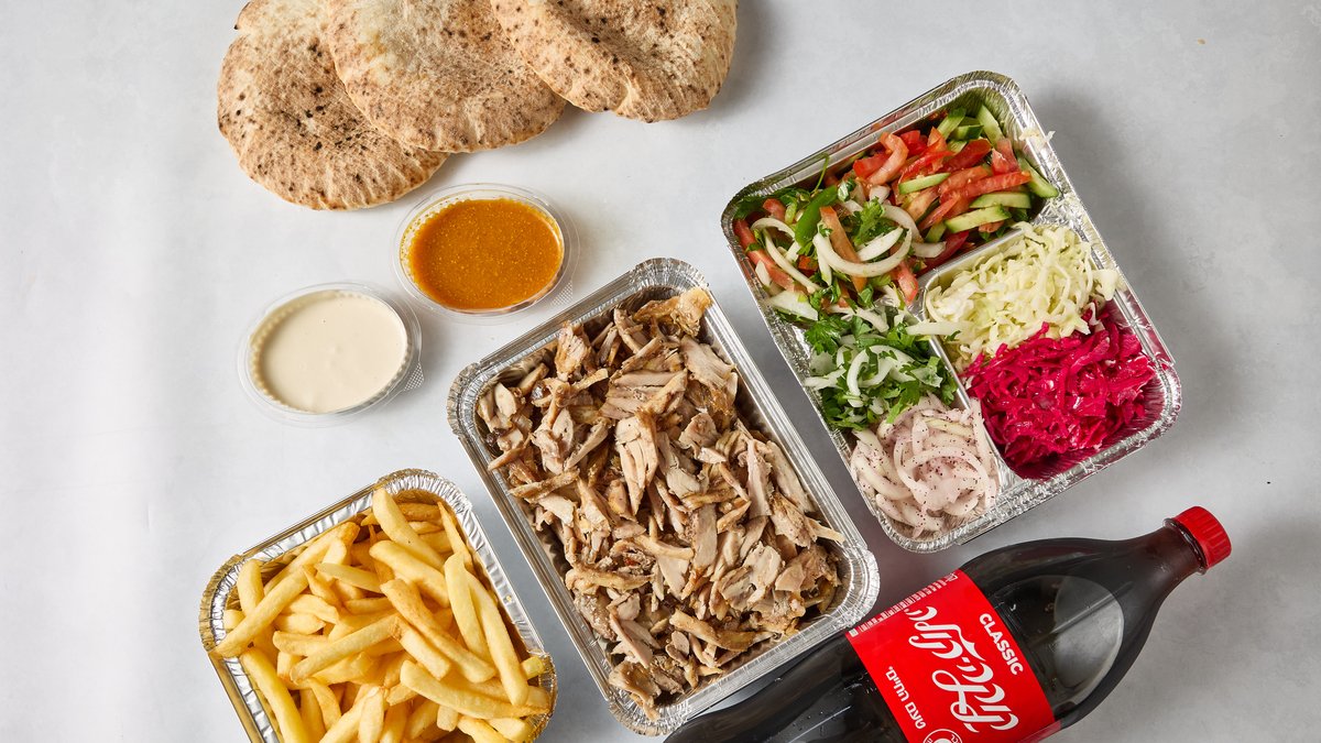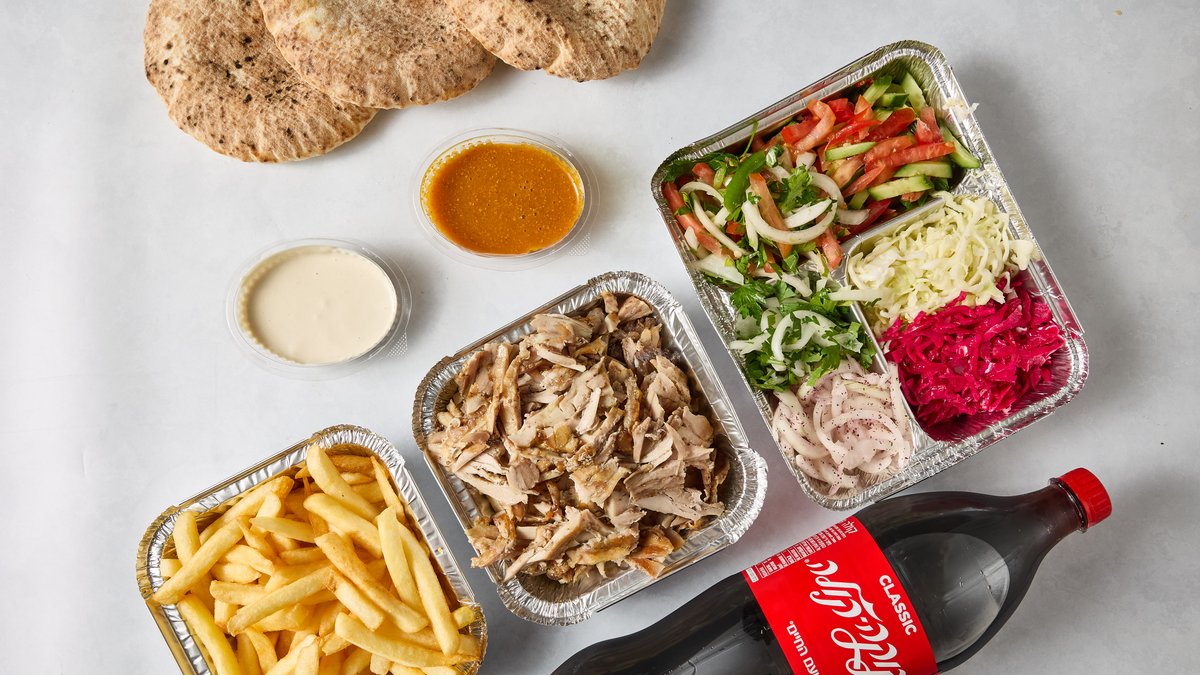 בחרו צורת הגשה, סוג שווארמה, סלטים וממרחים מוגש עם צ׳יפס ושתייה