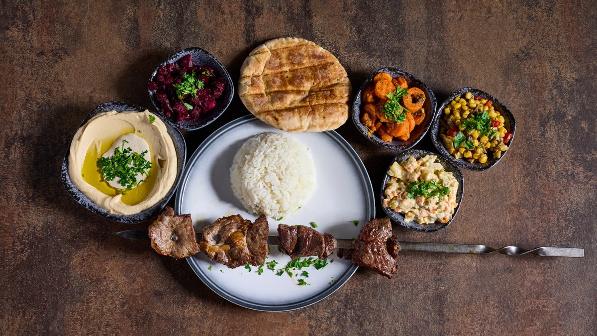 צלחת עם בשר לבחירה מוגש עם 6 סלטים ותוספת חמה לבחירה