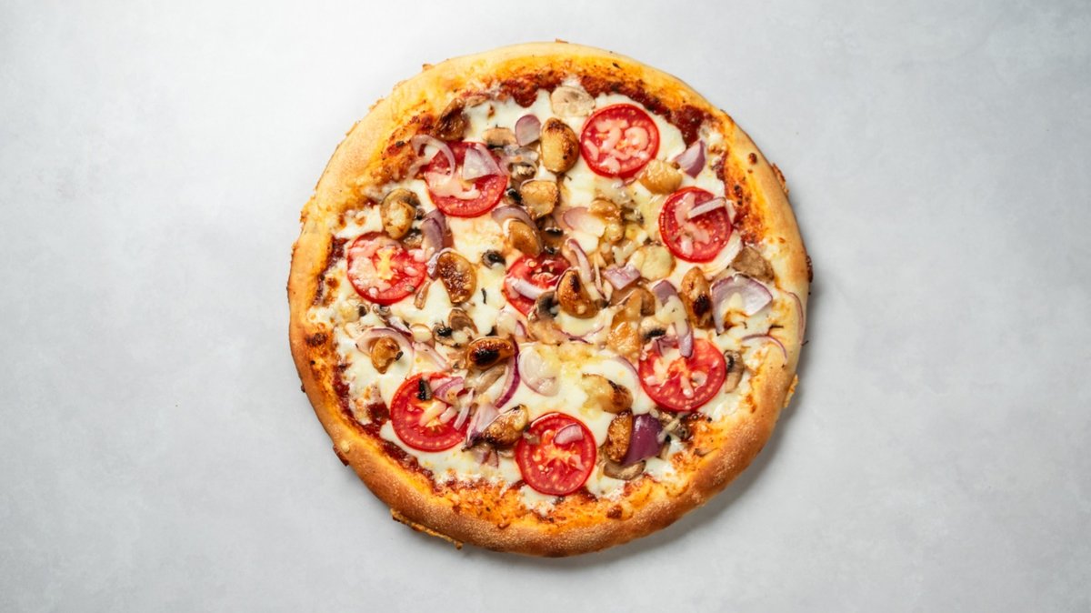 מוצרלה, רוטב עגבניות, פטריות, בצל סגול וזיתים ירוקים