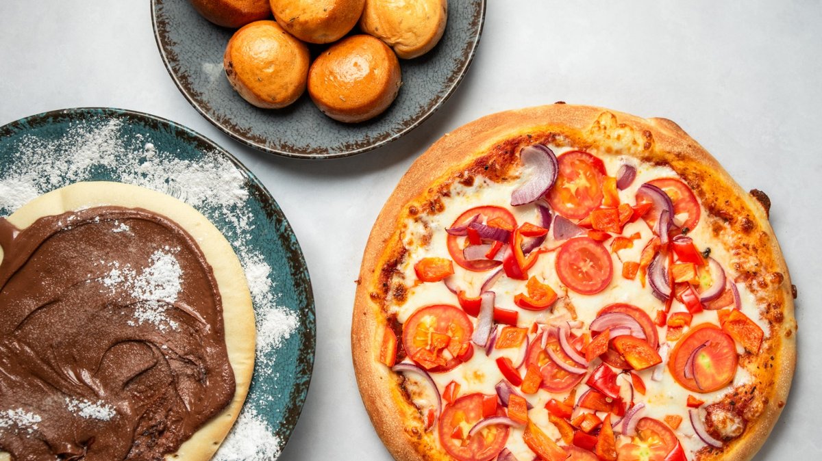 מוצרלה, רוטב עגבניות, בצל סגול, עגבניות חתוכות, זיתי קלמנטה, גבינה בולגרית ואורגנו