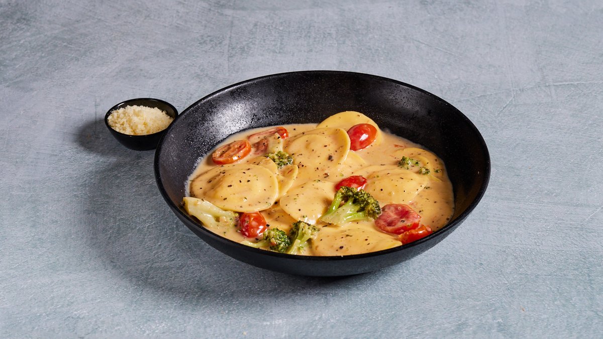 רביולי במילוי בטטה ברוטב לבחירה מוגש לצד פרמזן מגורד