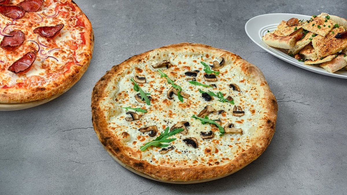 רוטב עגבניות, מוצרלה, תבשיל מנגולד, גאודה עזים, פטריות טריות, פרמזן וגרידת לימון