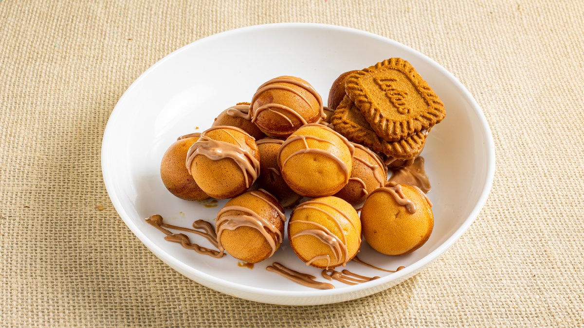 פנקייק, ממרח לוטוס, שברי עוגיות לוטוס וכדור גלידת קרמל