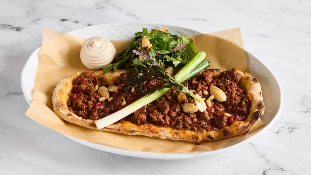 מאפה לבנטיני עם בשר טחון ותבשיל עגבניות, צנוברים ועלים ירוקים