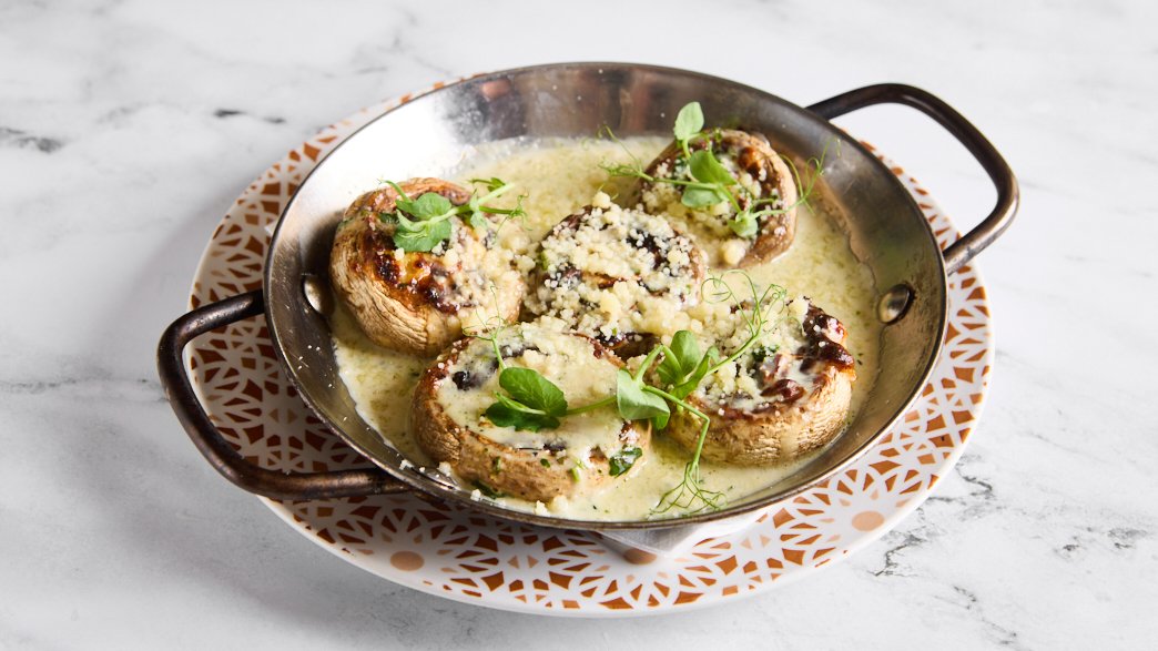 פטריות שמפיניון ממולאות בתערובת גבינות ועלי זעתר ברוטב שמנת בזיליקום