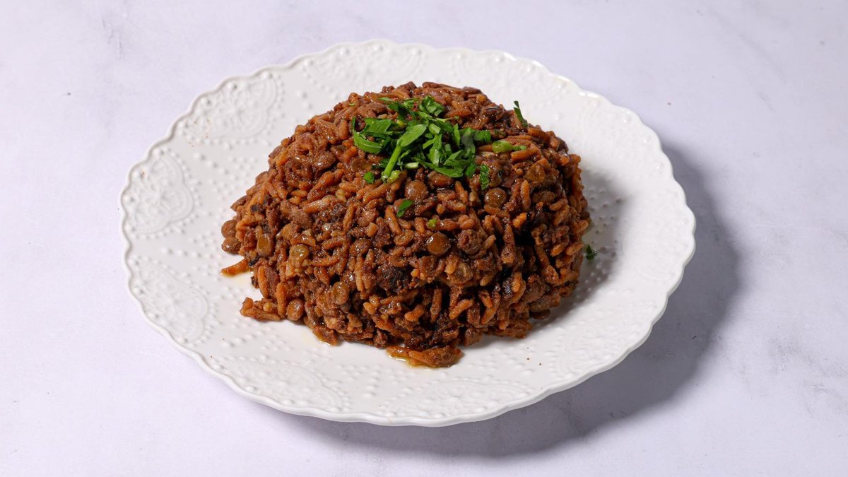 תבשיל אורז ועדשים שחורות מבושל לאט עם בצל מקורמל ותיבול עדין