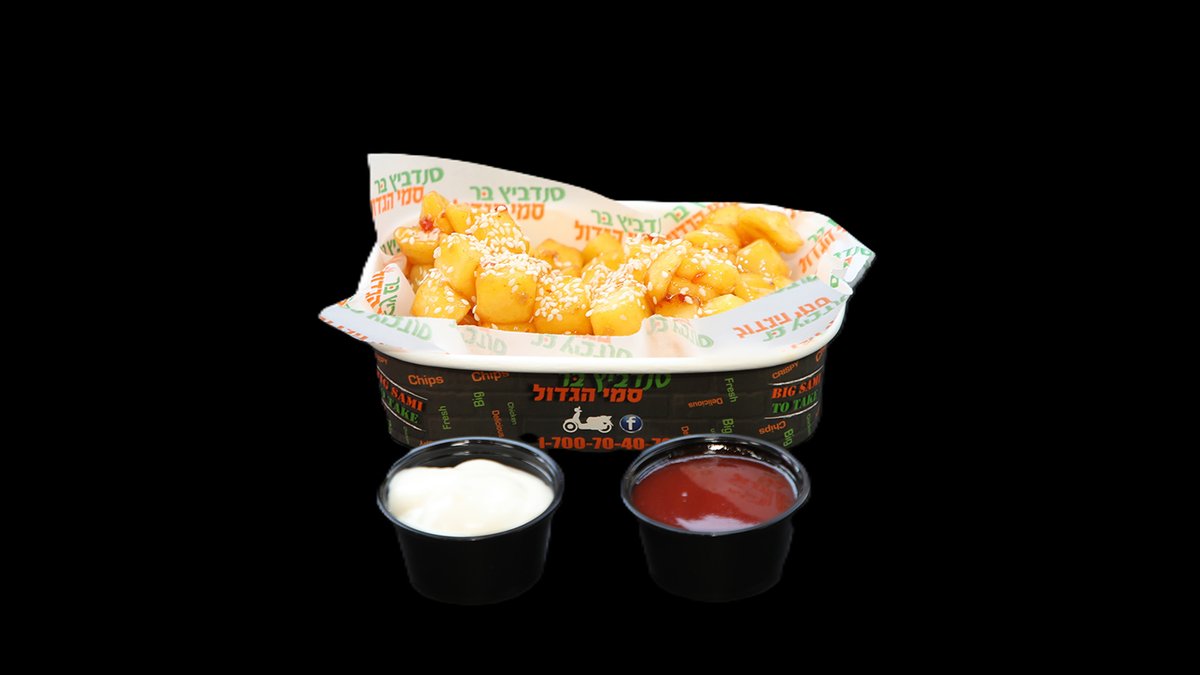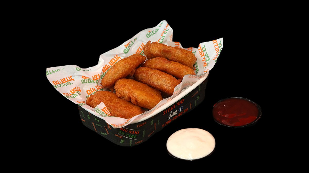 תיבול צ׳ילי חריף פיקנטי במעטפת פירורי זהב ושבבי צ׳ילי מוגש עם תוספת לבחירה