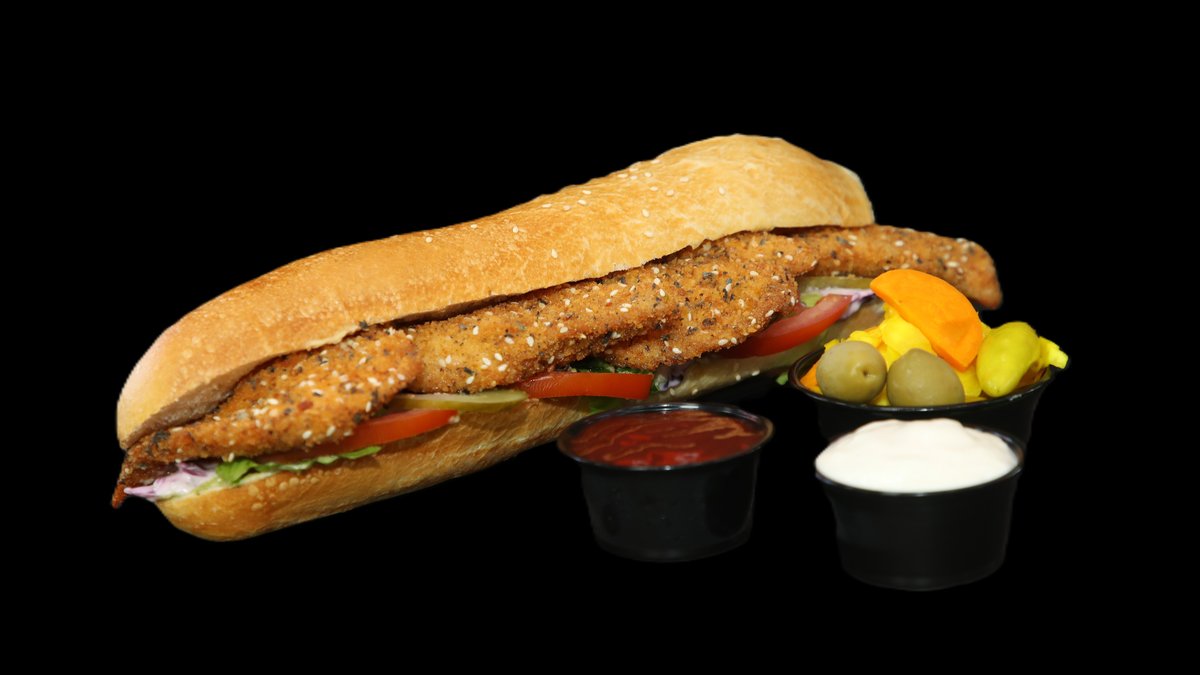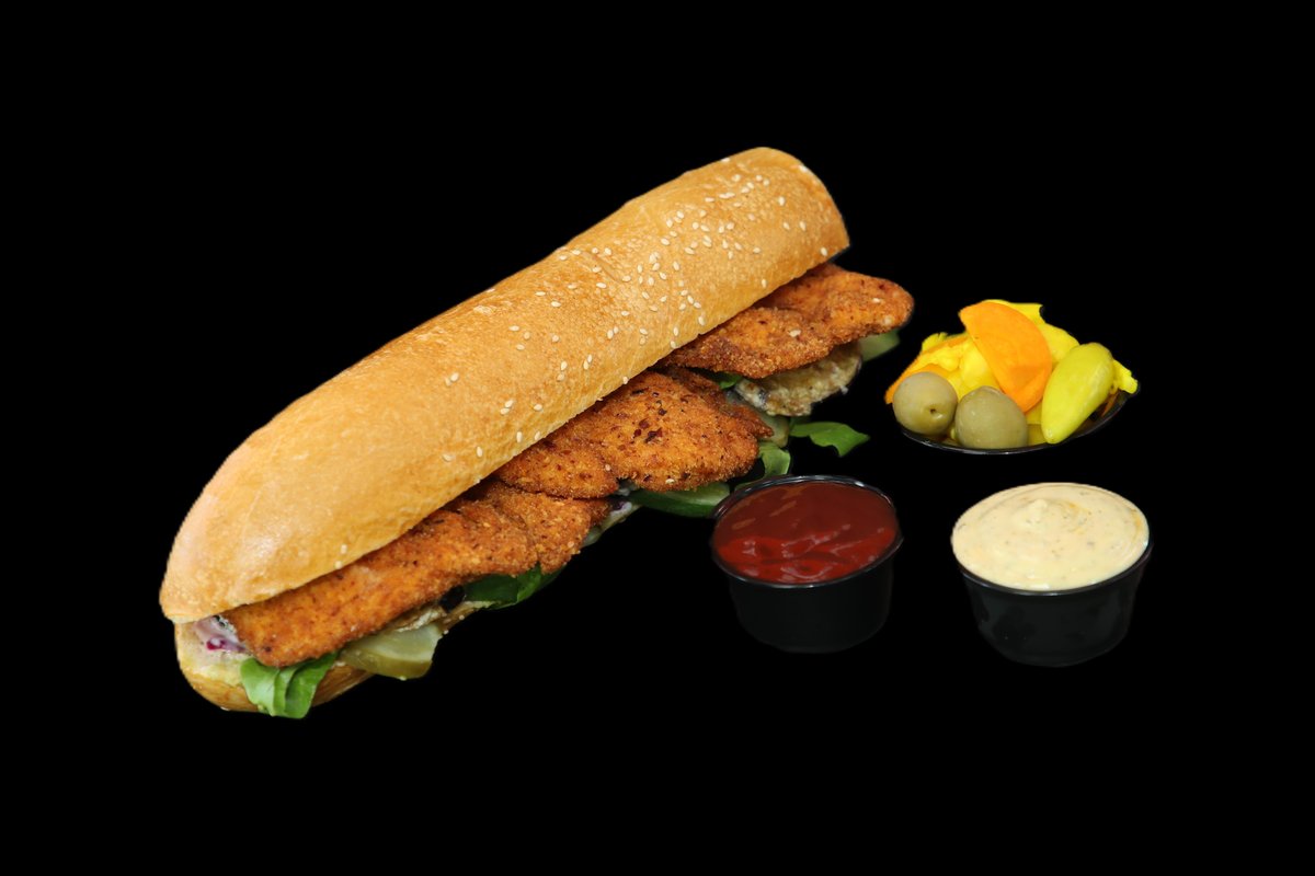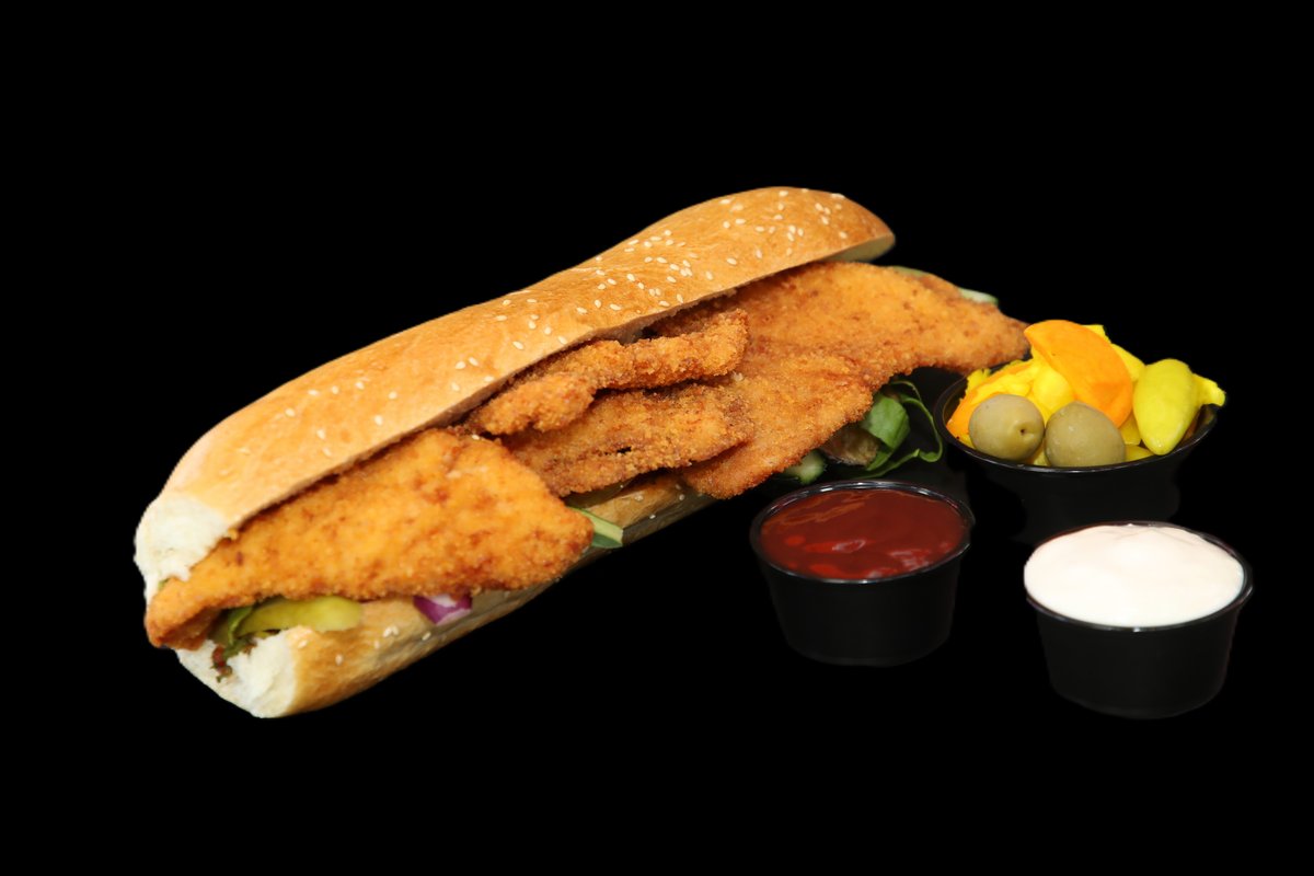 שניצל במעטפת עלי זעתר טחונים, פירורי זהב ושומשום בבגט