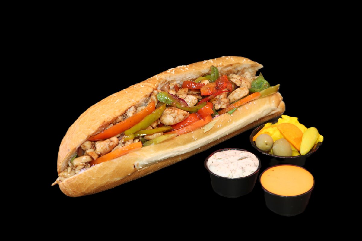 רצועות עוף על הפלאנצ'ה עם פלפל אדום וירוק, בצל סגול ברוטב חמוץ מתוק מוגש עם תוספת לבחירה