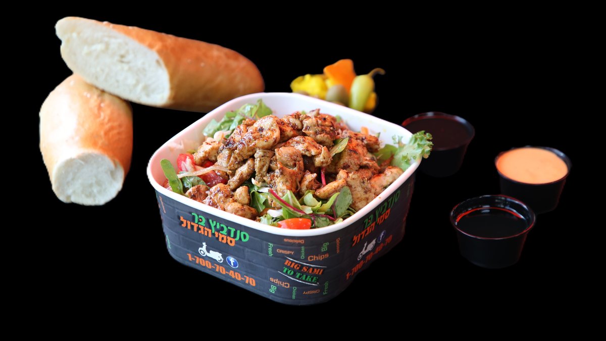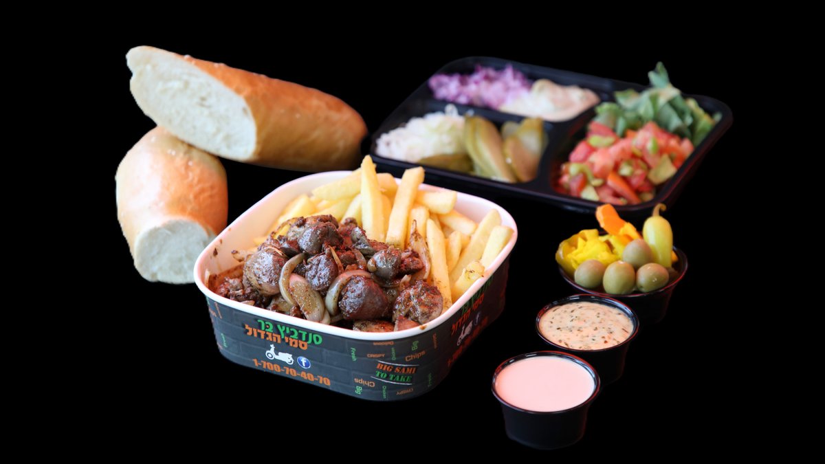 המנה מוגשת עם צלחת סלטים, תוספת חמה לבחירה, בגט חם, סלט רענן אישי, רטבים וחמוצים
