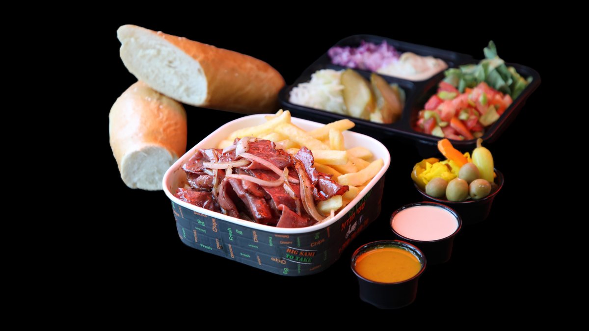פרוסות רוסטביף דק דק עם בצל צרוב עם תיבול לבחירה מוגש עם תוספת לבחירה