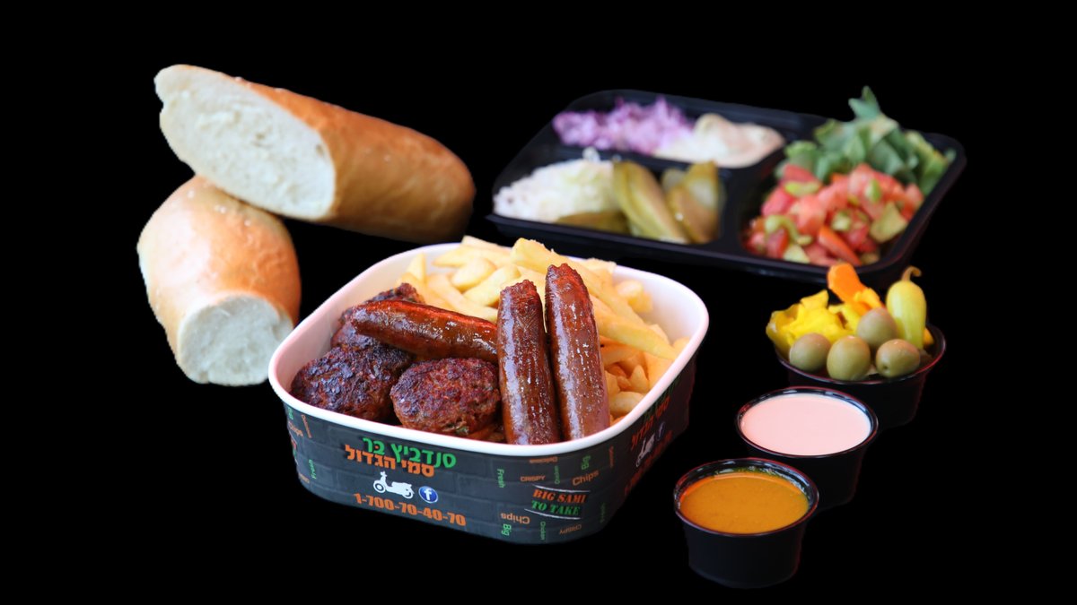 2 קציצות בקר ושומן כבש ו-2 נקניקיות מרגז מוגש עם תוספת לבחירה