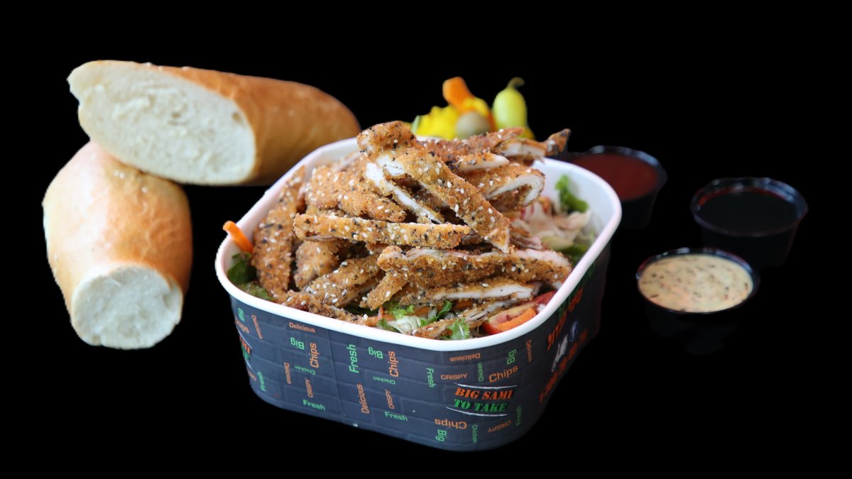 רצועות שניצל קריספי על סלט בתיבול לבחירה
