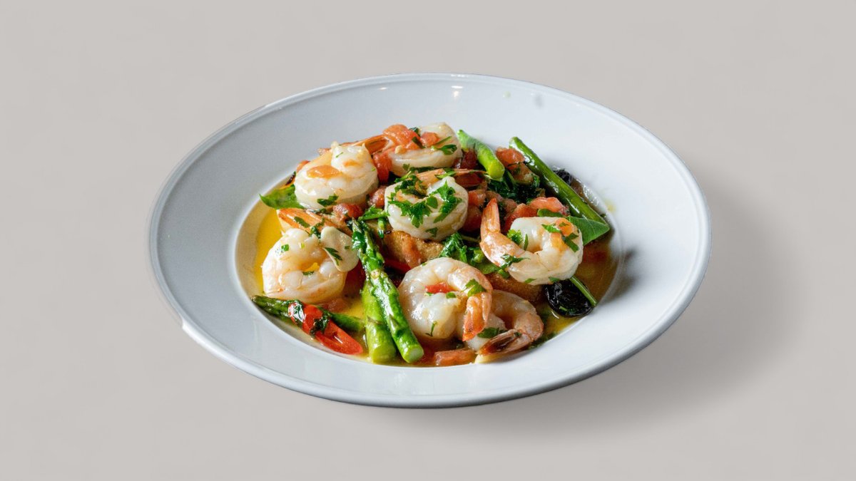 שרימפס מוקפץ במחבת עם עגבניות קונקסה, אספרגוס, זיתי טאסוס, צ'ילי, פטרוזיליה, אורוגולה, מיץ לימון, ציר ירקות, שום פרוס וחמאה. מוגש עם ברוסקטה