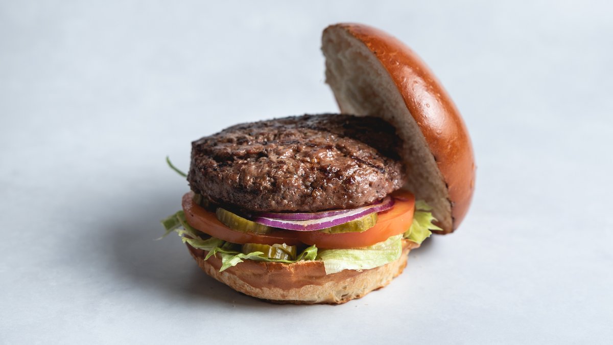 המבורגר במשקל 220 גרם (לפני צלייה) מנתחי טלה ובקר מובחרים מוגש בלחמניה עם חסה אייסברג, עגבניה, בצל סגול ופרוסות מלפפון כבוש