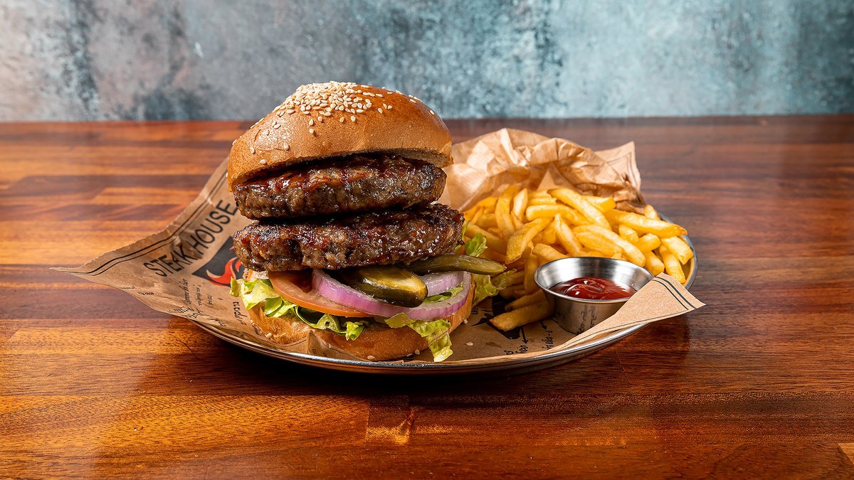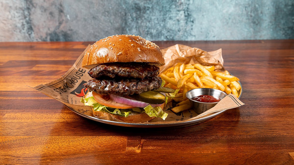 550 גרם בשר - המבורגר, סטייק, אנטריקוט, פרגית וכבד אווז עם בצל מטוגן מוגש בלחמנייה ותוספת לבחירה