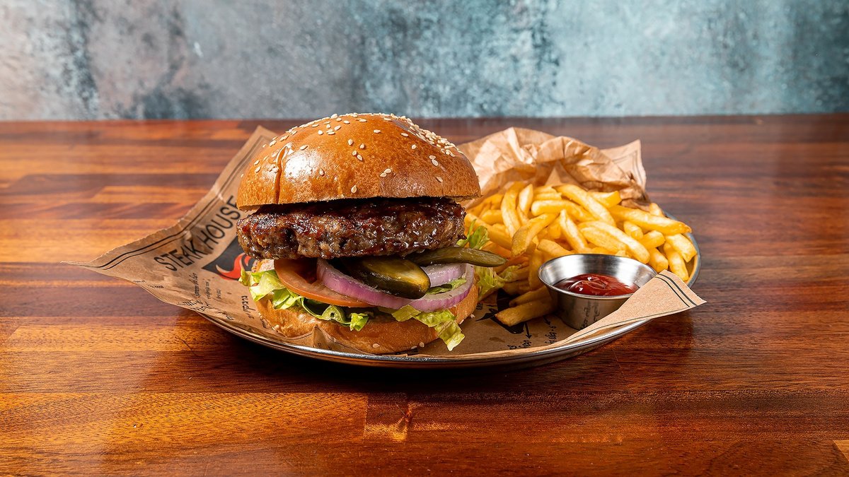 בורגר 200 גר העשוי ממכסה אנטריקוט ובריסקיט עם חסה, עגבנייה, בצל סגול ומלפפון חמוץ ביתי מוגש עם תוספת בצד לבחירה