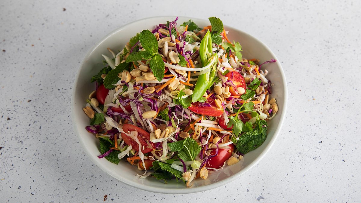 חסה אייסברג, אנדיב, כרוב סגול ולבן, גזר, בצל ירוק וסגול, נענע, כוסברה, נבטים בוטנים, צ'ילי וחזה עוף ברוטב חמאת בוטנים (קרם קוקוס, חמאת בוטנים, שום, כוסברה, סויה, חרדל, שמן תירס)