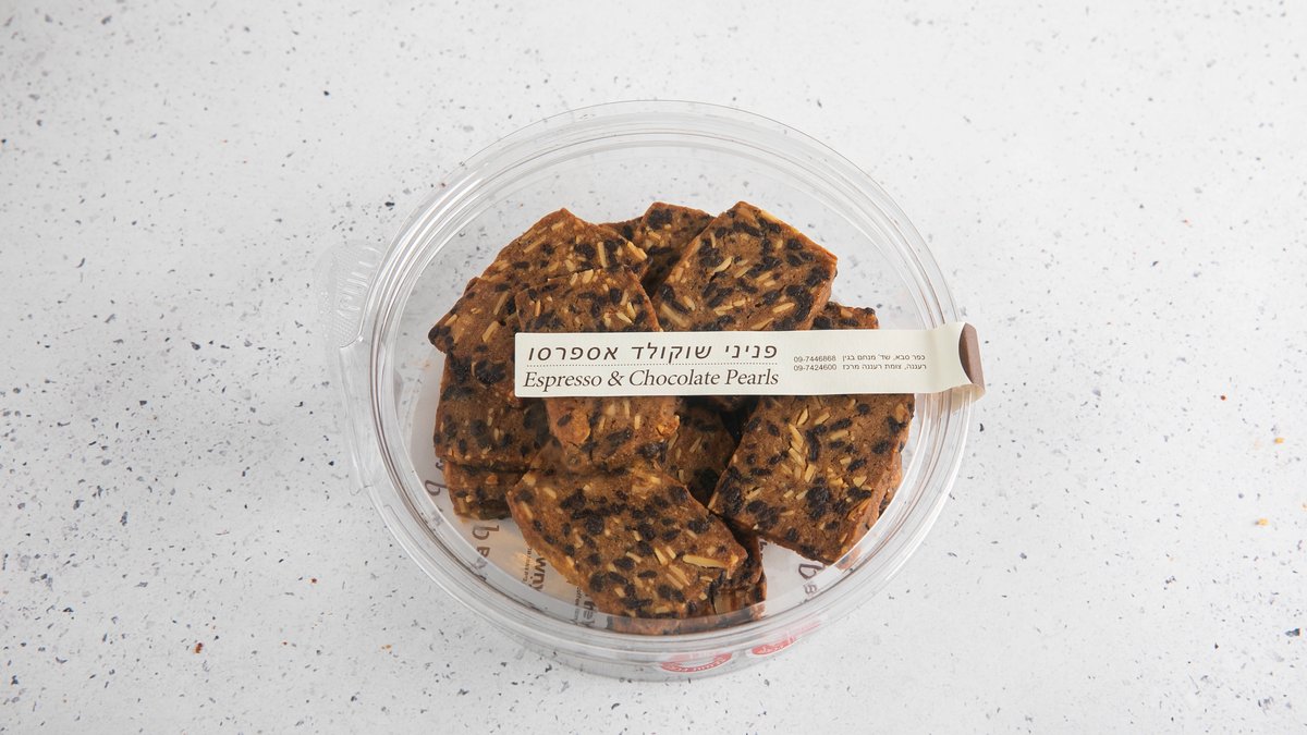 קמח, חמאה, סוכר ונס קפה. בשילוב פניני שוקולד מריר ושקדים פרוסים, מכיל גלוטן רכיבי חלב שקד פרוס , ללא ביצים
