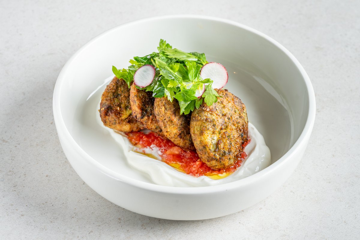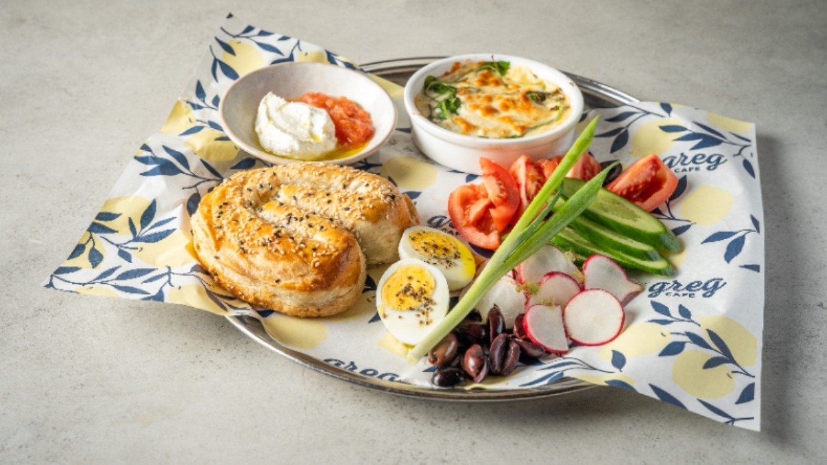 מאפה בצק עלים במילוי מנגולד וגבינות מוגש עם ביצה קשה, קאימק עגבניות מרוסקות, פונדו תרד וגבינות וירקות שוק